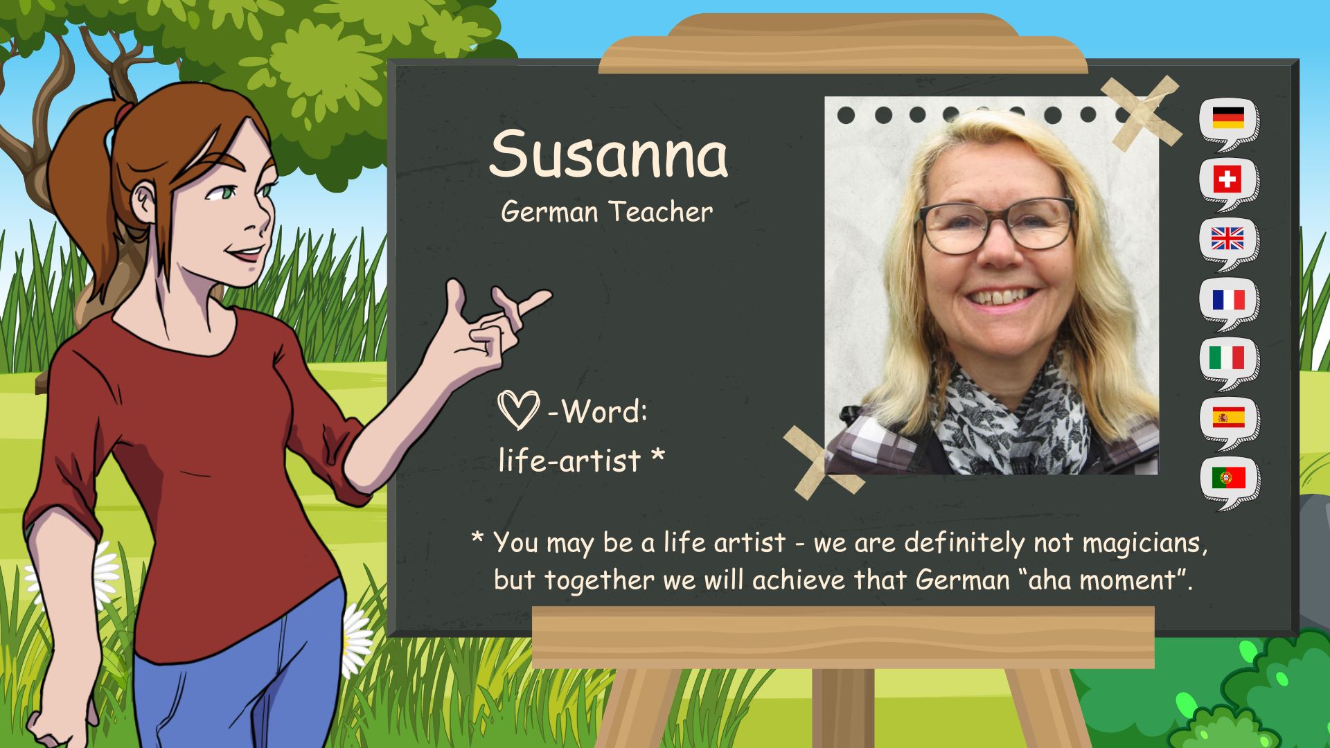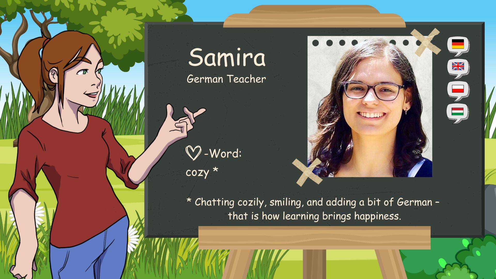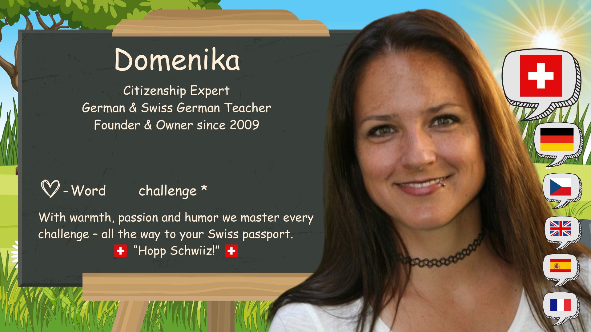 The “D” in D-SCHULE stands for “German ‘ and ’Domenika”. I was born here in Baar, Switzerland, on May 1, 1983. I have been fascinated by languages since I was a child. At home, my younger brother and I grew up bilingual. German and Czech. At school I learned French and English.