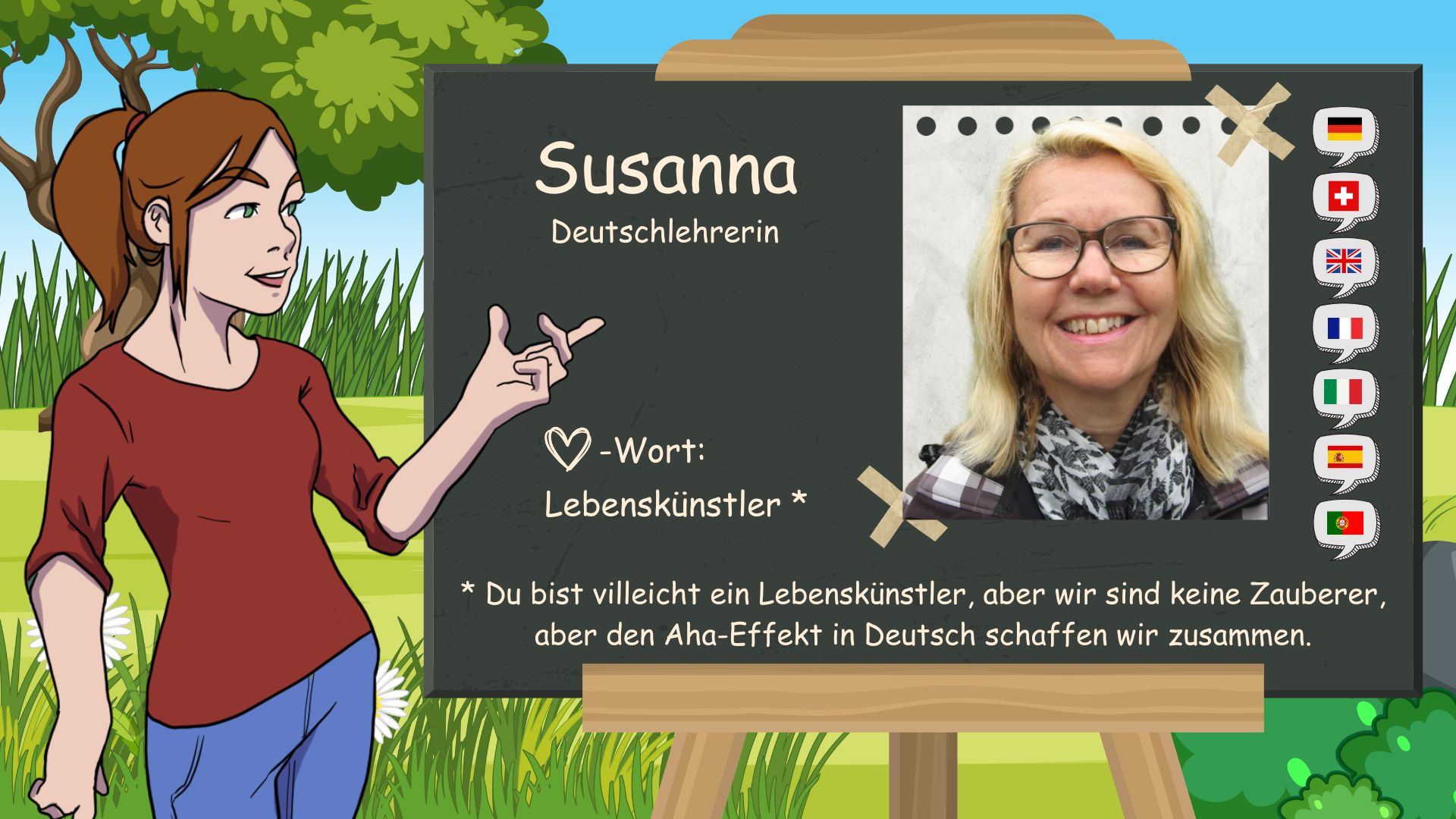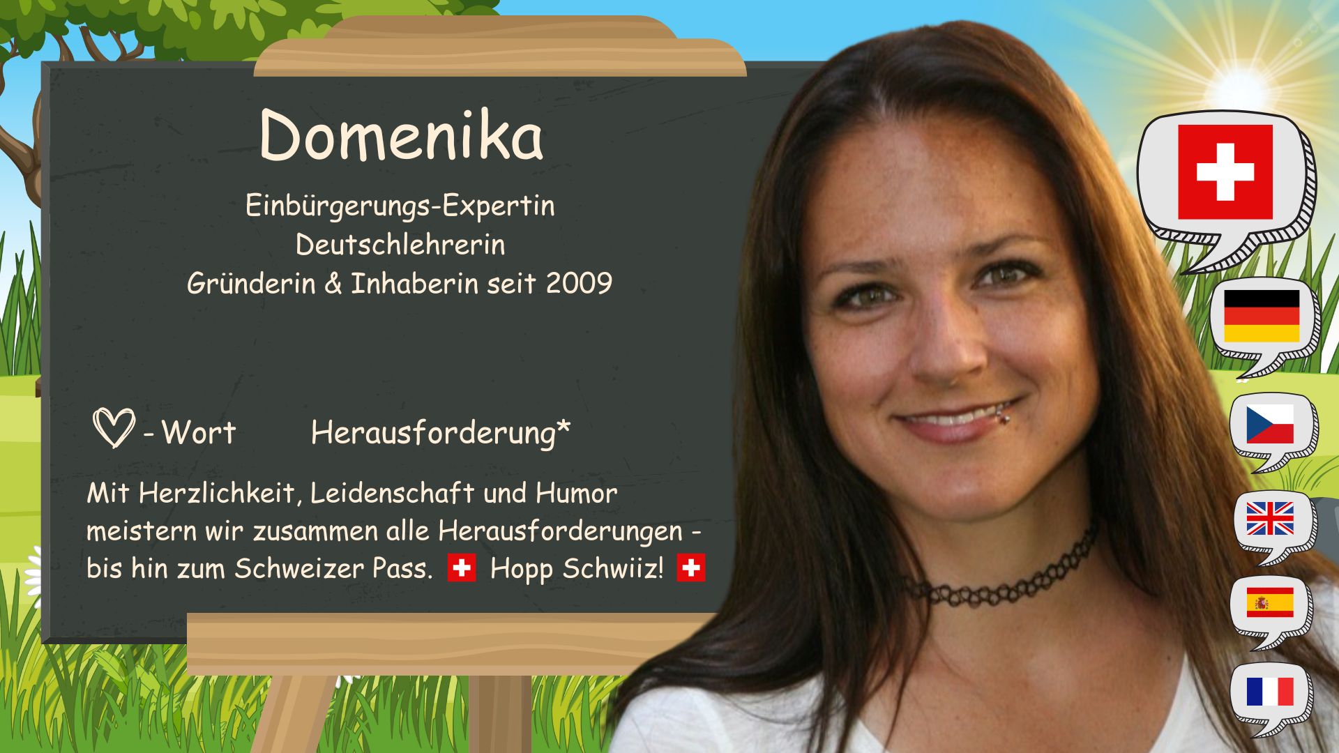 Das «D» in D-SCHULE steht für «Deutsch» und «Domenika». Hier in der Schweiz in Baar bin ich am 1. Mai 1983 geboren. Schon seit meiner Kindheit faszinierten mich Sprachen. Zu Hause sind mein jüngerer Bruder und ich zweisprachig aufgewachsen. Deutsch und Tschechisch. In der Schule lernte ich Französisch und Englisch. Meine Liebe zu Spanien liess mich auch Spanisch lernen!